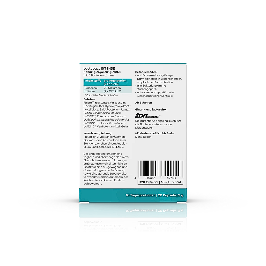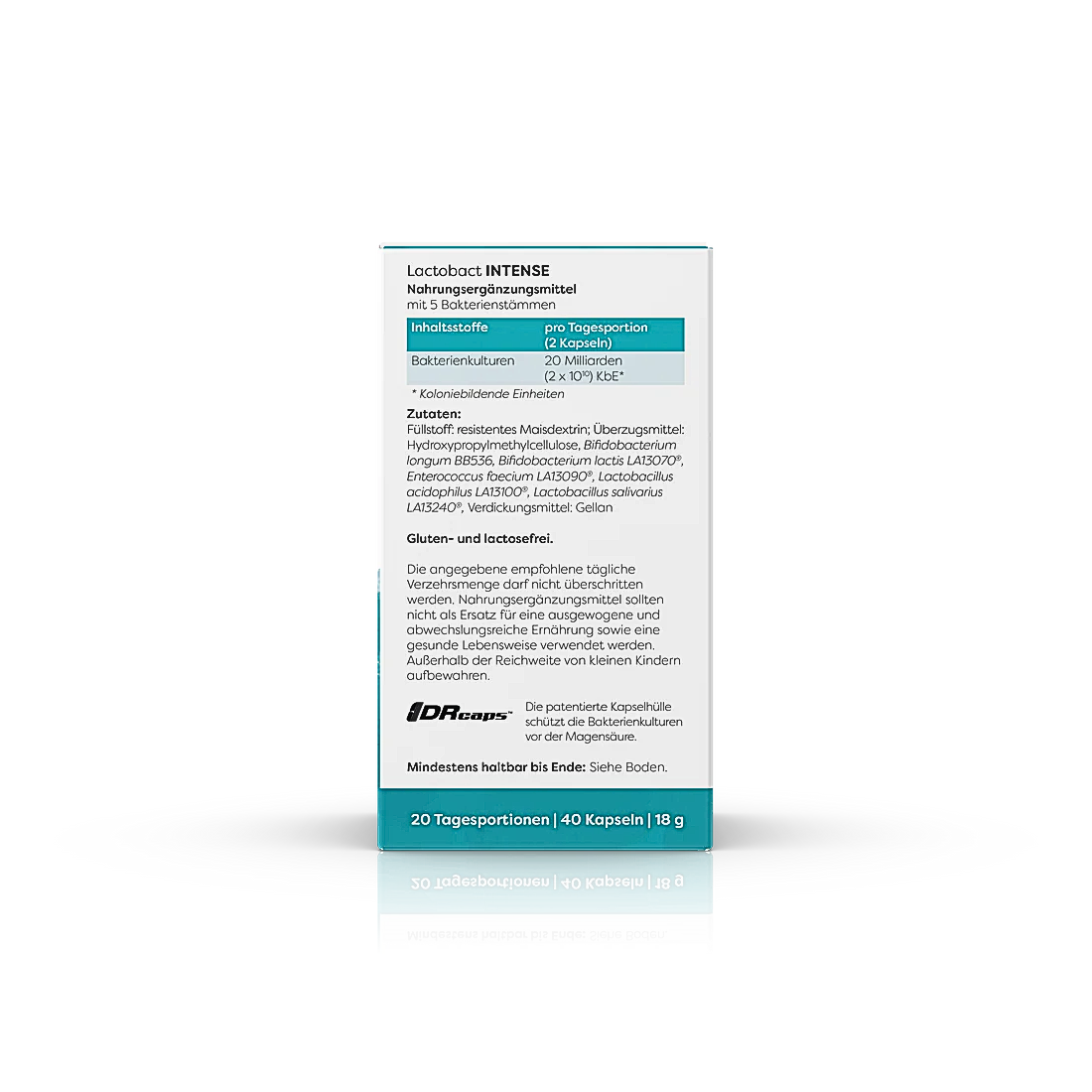 Lactobact INTENSE is enteric coated and contains 5 biologically active bacterial strains with a total bacterial count of 10 billion (1x10 10 ) colony forming units per capsule