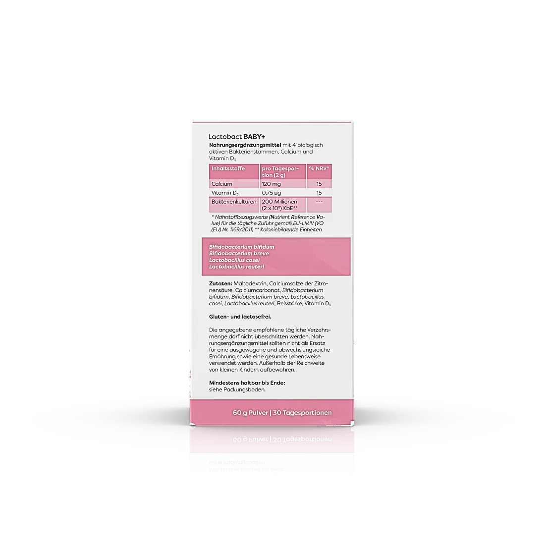 The probiotics in Lactobact Baby+ get extra ingredients of pantothenic acid (vitamin B5) and folic acid (vitamin B9). Both of these vitamins are very important for the development of your baby. Pantothenic acid supports the development of the central nervous system, while folic acid strengthens the immune system. Pregnant women also often have an increased need for both substances.